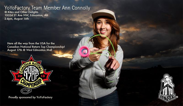 这周你会到加拿大埃德蒙顿参加 YOYO 比赛吗?因为版权的原因,YOYO 在加拿大有一个非常有趣的名字叫"Return Top",明天从两点到四点 Ann Connolly 将在当地的"Kites and Other Delights"潮物店教学和表演!